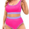 High-Waisted Two-Piece Swimsuit Plus Size: Round neck bikini top and tummy-control bikini bottoms perfectly show your collarbones and slender torso.